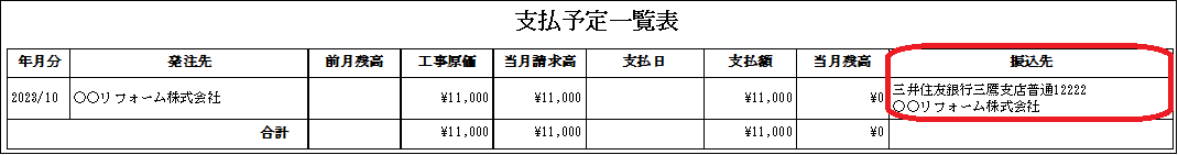回答・対処方法 工事発注管理画面の右下[支払一覧表]ボタンの帳票は、発注業者の振込先を印字し、帳票上で内容を確認することができます。 帳票名:「支払予定一覧表」