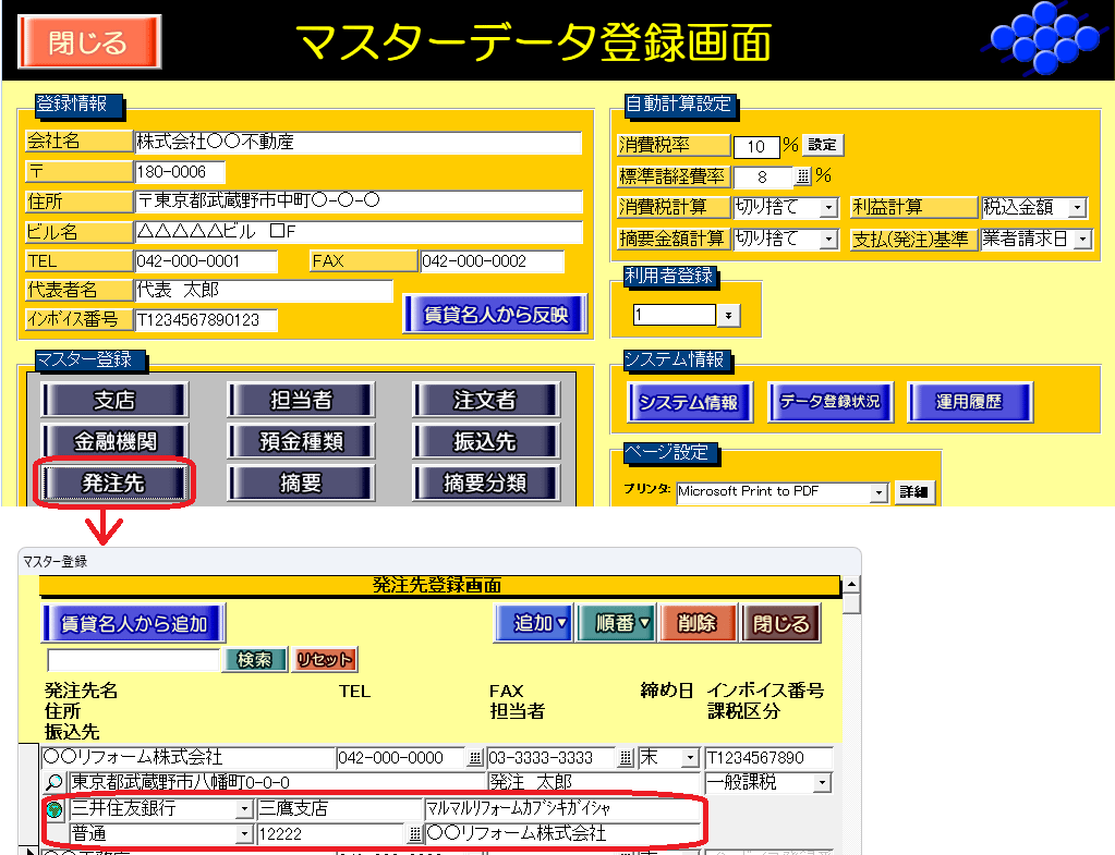 発注業者の振込先は、マスターデータ登録画面のマスター登録 [発注先]ボタンをクリックし、「振込先」欄で登録をします。