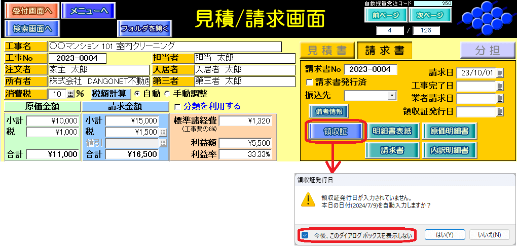 また、見積/請求画面の[請求書]タブの「領収書発行日」欄に、本日の日付を自動入力します。