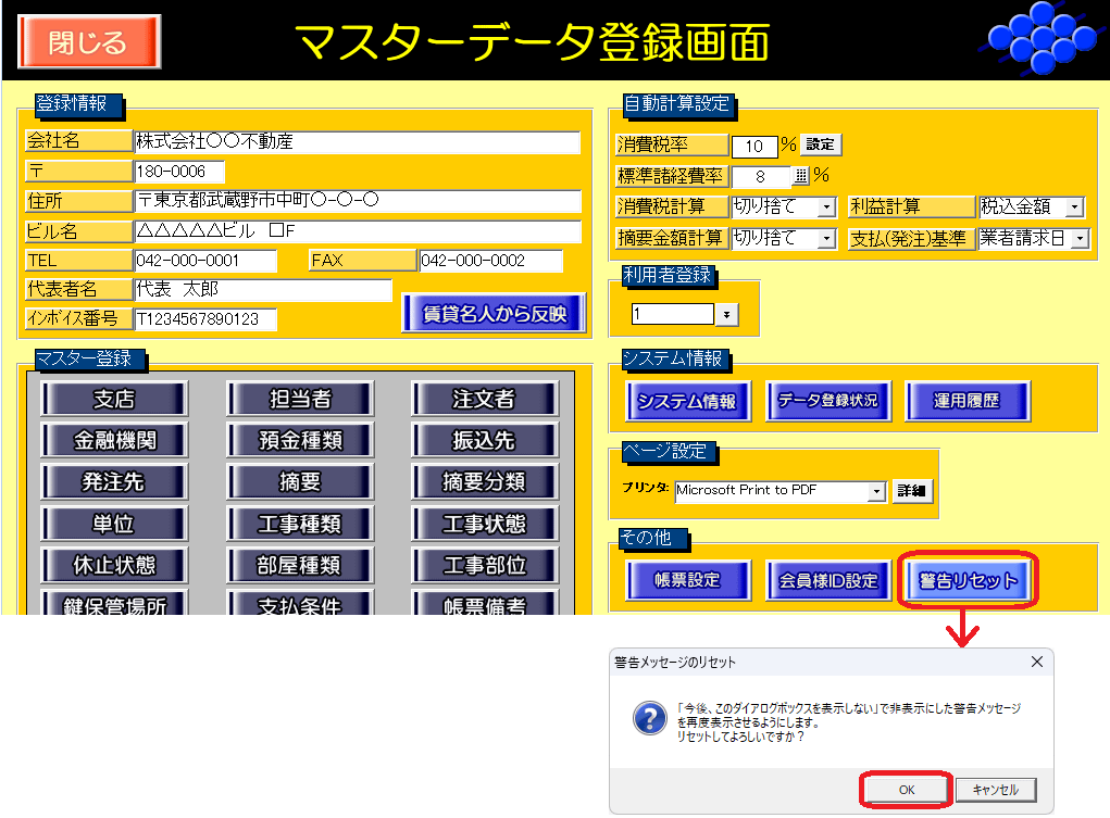 マスター管理の警告リセットボタンを実行し、確認ウインドウを再表示します。