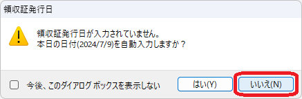 以下の「領収証発行日」のメッセージは[いいえ]ボタンを押し、収証発行日を空欄(ブランク)にします。